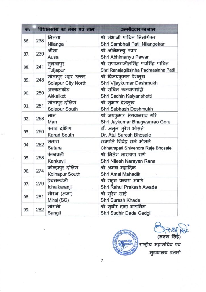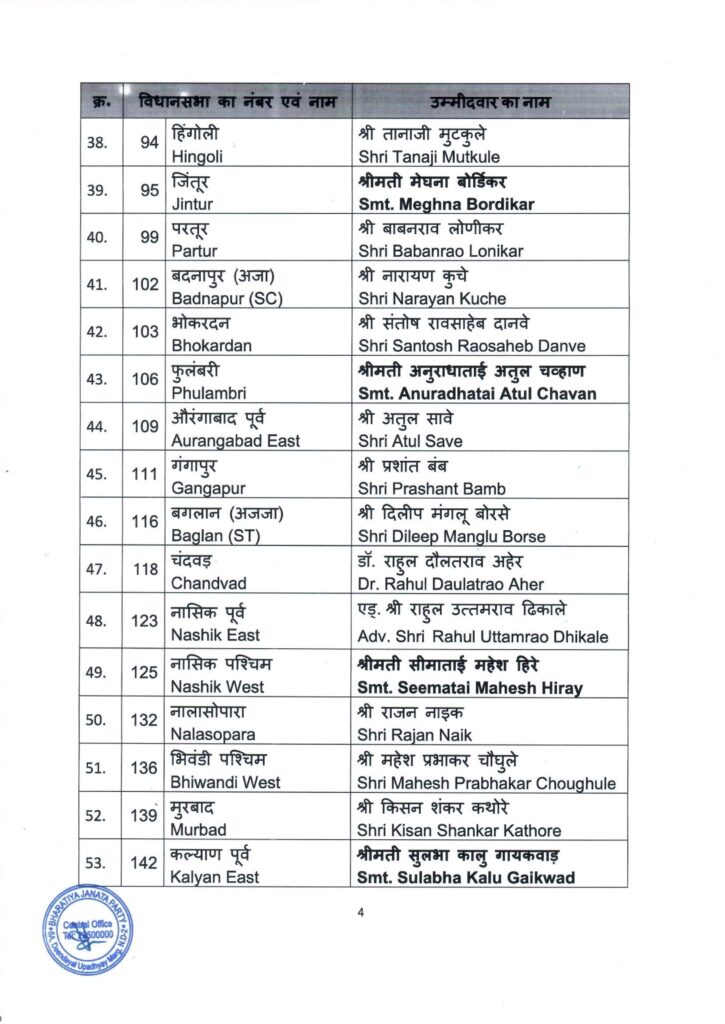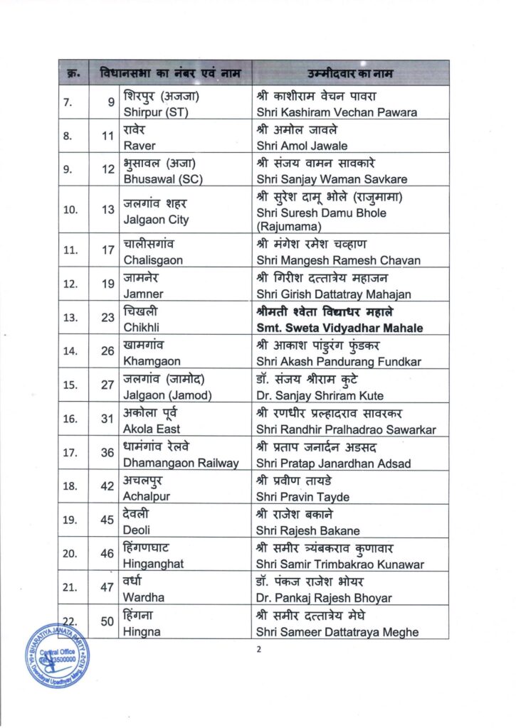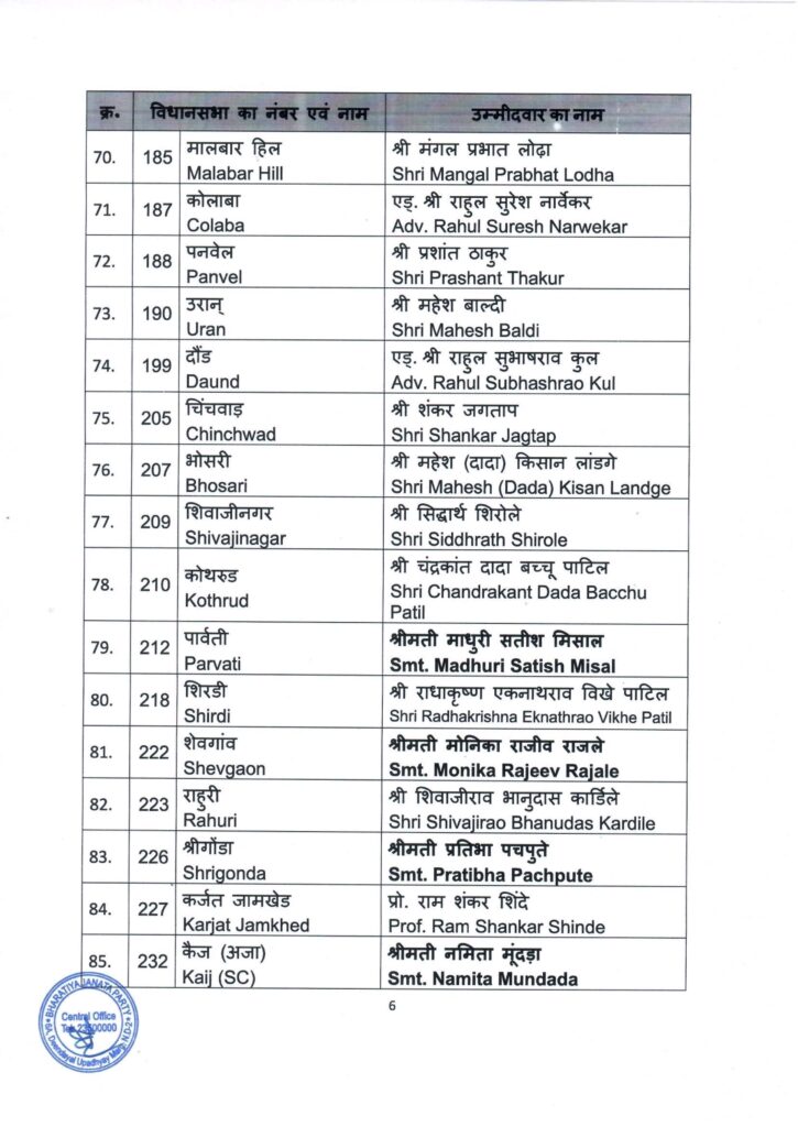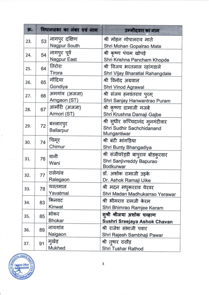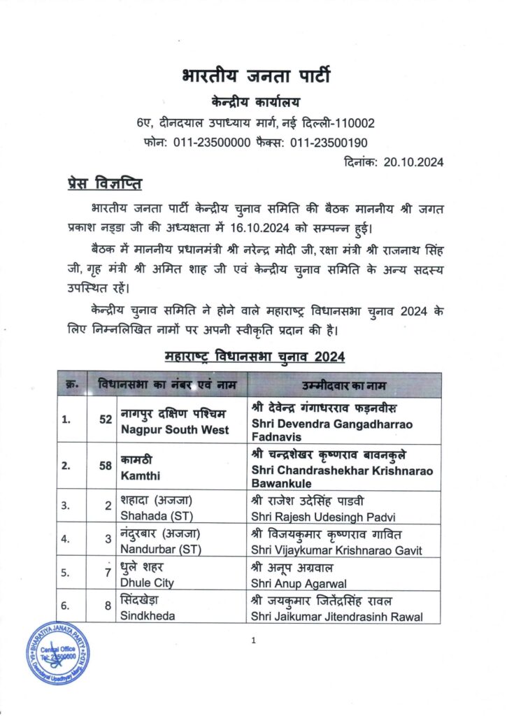 भारतीय जनता पार्टी केंद्रीय निवडणूक समितीची बैठक १६-१०-२०२४ रोजी भाजपा अध्यक्ष जगत प्रकाश नड्डा यांच्या अध्यक्षतेखाली झाली. या बैठकीस प्रधानमंत्री श्री नरेंद्र मोदी, संरक्षण मंत्री राजनाथ सिंह, गृहमंत्री अमित शाह आणि केंद्रीय निवडणूक समितीचे इतर सदस्य या उपस्थित होते. ह्या बैठकीत आगामी होणाऱ्या महाराष्ट्र विधानसभा निवडणूक २०२४ साठी केंद्रीय निवडणूक समितीने निवडणुका लढू इच्छिणाऱ्या उमेदवारानच्या नावांना मान्यता दिली आहे. ह्या मध्ये प्रमुख्याने पाहिले नाव महाराष्ट्राचे उपमुख्यमंत्री देवेंद्र गंगाधरराव फडणवीस यांना नागपूर दक्षिण पश्चिम ५२ येथून उमेदवारी देण्यात आली आहे. उर्वरित उमेदवार