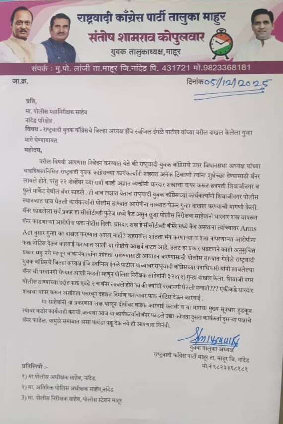 २२ नोव्हेंबरच्या रात्री अज्ञात व्यक्तींनी धारदार शस्त्राचा वापर करून बॅनर फाडल्याचा प्रकार सीसीटीव्हीमध्ये स्पष्टपणे कैद झाला आहे. तरीही संबंधित आरोपींवर शस्त्र कायद्यानुसार (Arms Act) गुन्हा दाखल करण्यात न आल्याचे गंभीर आरोप करण्यात येत आहेत. शहरातील शांतता भंग करणाऱ्या या प्रकारावर कठोर भूमिका घेण्याऐवजी केवळ नोटीस देऊन प्रकरण दाबले गेल्याचा आरोप कार्यकर्त्यांनी केला आहे.दरम्यान, या घटनेनंतर कोणताही अनुचित प्रकार घडू नये, यासाठी पोलीस ठाण्यात गेलेल्या राष्ट्रवादी युवक काँग्रेसचे जिल्हाध्यक्ष इंजि. स्वप्निल इंगळे पाटील यांच्यावर बॅनर परवानगी नसल्याच्या कारणावरून कलम ३२४(२) अंतर्गत गुन्हा दाखल करण्यात आला. यामुळे पोलीस प्रशासन दुहेरी भूमिका घेत असल्याचा संशय व्यक्त केला जात आहे.या प्रकरणात दोषींवर कठोर कारवाई करावी व मुख्य सूत्रधाराला अटक करावी, तसेच इंजि. स्वप्निल इंगळे पाटील यांच्यावरील गुन्हा तात्काळ मागे घ्यावा, अशी मागणी राष्ट्रवादी काँग्रेसचे युवक तालुका अध्यक्ष यांनी पोलीस महानिरीक्षक नांदेड परिक्षेत्र यांच्याकडे निवेदनाद्वारे केली आहे.”आज आम्ही बॅनर फाडल्यावर शांततेचे आवाहन केले, उद्या दुसरा कोणी वेगळ्या पक्षाचा बॅनर फाडून समाजात तेढ निर्माण करेल. असा पायंडा पडू देऊ नये,” असेही निवेदनात नमूद करण्यात आले आहे.या घटनेमुळे राजकीय वर्तुळात खळबळ उडाली असून, पोलीस प्रशासन पुढे काय भूमिका घेते याकडे संपूर्ण जिल्ह्याचे लक्ष लागले आहे.