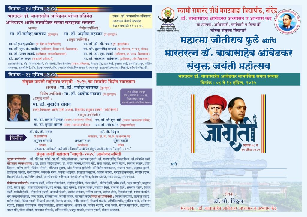 या समारोपीय कार्यक्रमाला प्रसिद्ध विचारवंत विद्यापीठ अनुदान आयोगाचे माजी अध्यक्ष डॉ. सुखदेव थोरात यांच्या विशेष व्याख्यानाचे आयोजन करण्यात आले आहे. विद्यापीठाच्या सिनेट सभागृहात होणाऱ्या विशेष व्याख्यानास कुलगुरू डॉ. मनोहर चासकर यांच्या अध्यक्षतेखाली संयुक्त जयंती महोत्सव समारोप संपन्न होईल. या जयंती महोत्सवास डॉ. रवी एन. सरोदे, डॉ. राजेंद्र गोणारकर ,काळबा हणवते, डॉ. राजपालसिंह चिखलीकर ,डॉ. हर्षवर्धन दवणे यांचे वेळोवेळी मार्गदर्शन लाभत असून हा संयुक्त जयंती महोत्सव संपन्न करण्यासाठी डॉ. प्रशांत घोडवार्डीकर , संदीप जाधव डॉ.नितीन गायकवाड, डॉ. नारायण गोरे, संभा कांबळे ,संदीप एडके, स्वप्निल नरबाग, प्रदीप बिडला, सतीश वागरे,विवेक भोसले, संविधान दुगाणे, एड. भीमराव सूर्यवंशी ,राजनाथ पवार ,ऋतुराज बुक्तरे, तेजस्विनी कांबळे, मनोहर सोनकांबळे, जयवर्धन गच्चे,जयवंत आठवले, विशाल कंधारकर आदी परिश्रम घेत आहेत. तरी या जागृती २०२५ संयुक्त जयंती महोत्सव सर्वांनी आपला सहभाग ग नोंदवावा असे आवाहन डॉ. पी. विठ्ठल , अनुपम सोनाळे यासह संयुक्त जयंती महोत्सव समितीने केली आहे.