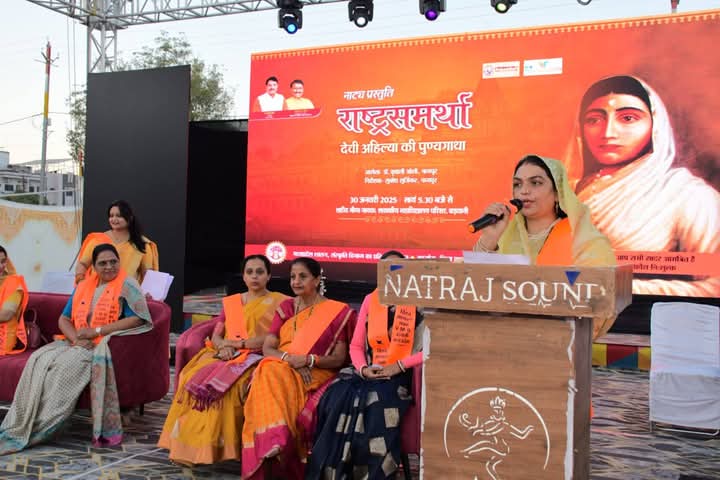 . दि.31 बड़वानी (मध्य. प्र) —————————————–लोकमाता देवी अहिल्या बाई होल्कर जी की 300 वीं जन्मशताब्दी वर्ष के उपलक्ष्य पर संस्कृति विभाग मध्यप्रदेश शासन व विश्वमांगल्य सभा के संयुक्त तत्वावधान में शहीद भीमा नायक शासकीय स्नातकोत्तर महाविद्यालय बड़वानी में राष्ट्रसमर्था पुण्यश्लोक माता अहिल्या बाई के अद्वितीय शौर्य गाथा पर विशेष नाट्य मंचन का आयोजन नागपुर के कलाकारों के द्वारा दिया गया। जिसमें देवी अहिल्या बाई के व्यक्तित्व एवं कृतित्व से समारोह में उपस्थितजनों को परिचय कराया।