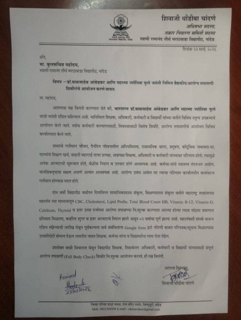 नांदेड दि. ७ एप्रिल (ग्रामीण प्रतिनिधी ) भारतरत्न डॉ. बाबासाहेब आंबेडकर आणि महात्मा ज्योतिबा फुले यांच्या जयंतीचे औचित्य साधून स्वामी रामानंद तीर्थ मराठवाडा विद्यापीठातील शिक्षक, अधिकारी, कर्मचारी आणि विद्यार्थ्यांसाठी ‘नि:शुल्क आरोग्य तपासणी’ (Full Body Checkup) शिबिर आयोजित करण्याची मागणी अधिसभा सदस्य शिवाजी धोंडीबा चांदणे यांनी केली आहे. यासंदर्भात त्यांनी विद्यापीठाचे कुलसचिव यांना लेखी निवेदन दिले आहे. सध्याच्या धावपळीच्या जीवनात कौटुंबिक जबाबदाऱ्या, वाढती महागाई, प्रदूषण आणि अनियमित जीवनशैली यामुळे कर्मचाऱ्यांच्या आरोग्यावर प्रत्यक्ष-अप्रत्यक्ष परिणाम होत आहेत.