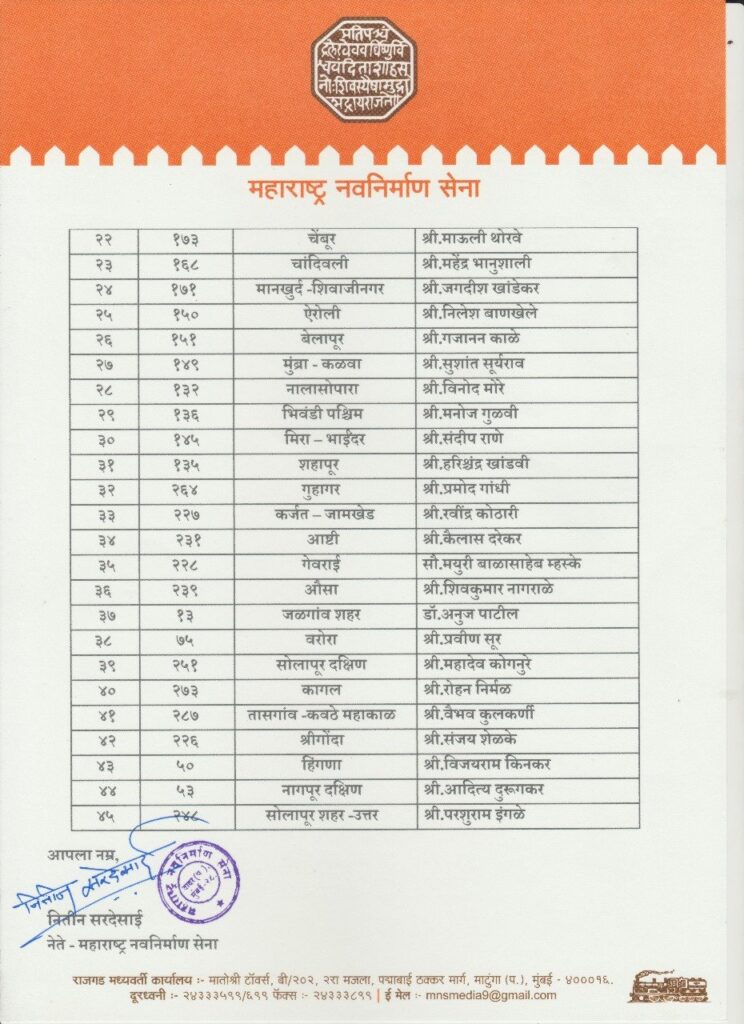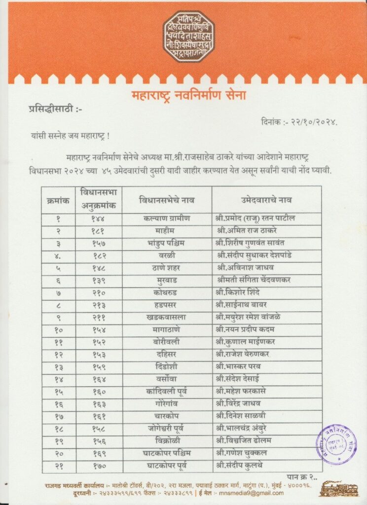 दि.२२ संजय भोकरे, (प्रतिनिधी,मुंबई); महाराष्ट्र विधानसभा निवडणुकीसाठी मनसेने ४५ उमेदवारांची यादी जाहीर केली आहे. ठाकरे कुटुंबातील आणखी एक सदस्य महाराष्ट्र विधानसभा निवडणुकीत पदार्पण करणार आहे. महाराष्ट्र नवनिर्माण सेनेचे (मनसे) अध्यक्ष राज ठाकरे यांचे पुत्र अमित ठाकरे यांना मुंबईतील माहीम मतदारसंघातून मनसेचे उमेदवार म्हणून घोषित करण्यात आले आहे. महाराष्ट्रात २० नोव्हेंबरला निवडणुका होणार आहेत, तसेंच मनसेचे प्रवक्ते आणि माजी नगरसेवक संदीप देशपांडे वरळीतून निवडणूक लढवणार आहेत.