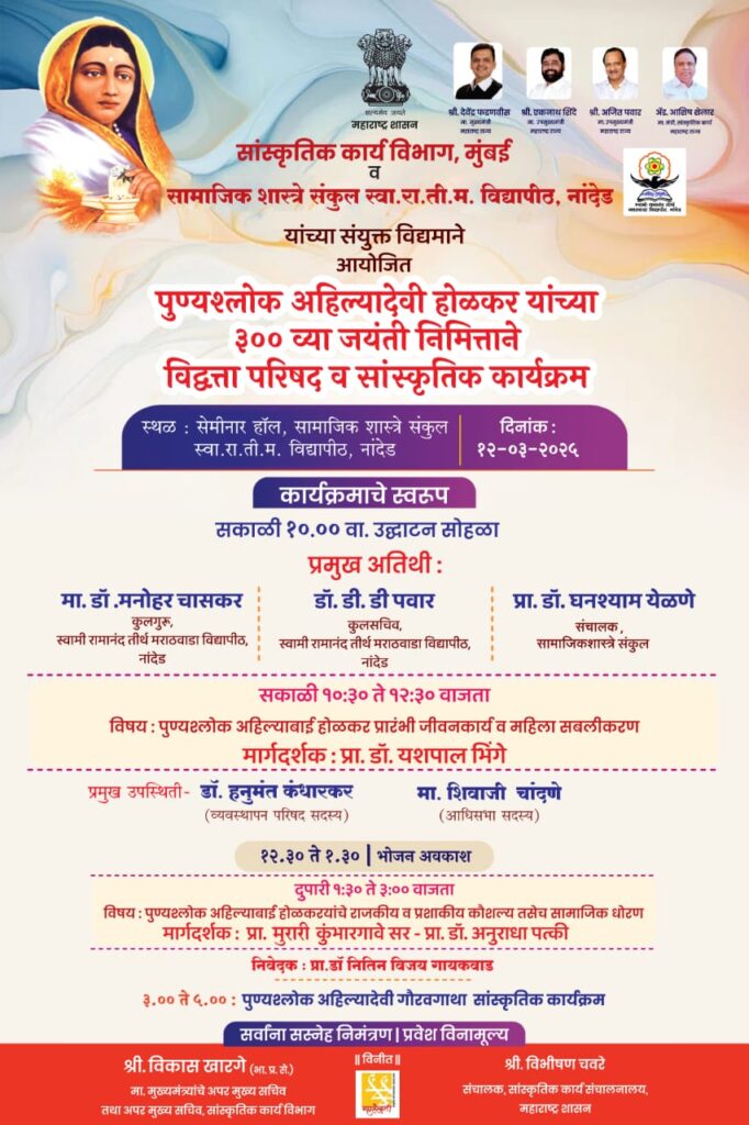 यांच्या संयुक्त विद्यमाने आयोजित पुण्यश्लोक अहिल्यादेवी होळकर यांच्या ३०० व्या जयंती निमित्ताने विद्वत्ता परिषद व सांस्कृतिक कार्यक्रम सेमीनार हॉल, सामाजिक शास्त्रे संकुल स्वा.रा.ती.म. विद्यापीठ, नांदेड येथे संपन्न झाला. या कार्यक्रमाचे अध्यक्ष म्हणून प्रा. डॉ. घनश्याम येळणे