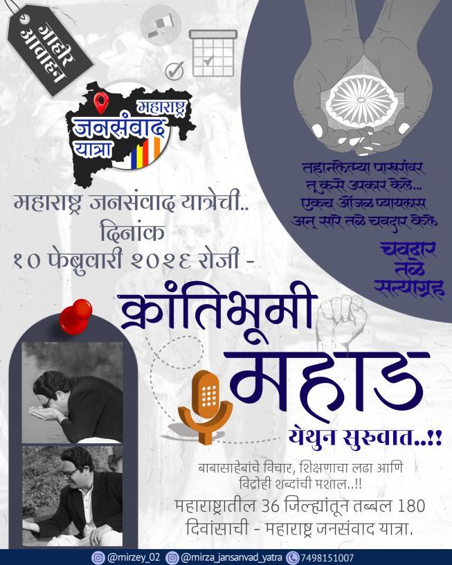 दि. ३० महाड | (विशेष प्रतिनिधी) —————- शेकडो वर्षांची गुलामगिरी ज्या चवदार तळ्याच्या काठावर डॉ. बाबासाहेब आंबेडकरांनी मूठभर पाण्याने चिरडून टाकली, त्याच पवित्र क्रांतिभूमीतून आता सामाजिक परिवर्तनाचा नवा हुंकार घुमणार आहे. “शिक्षण हीच सामाजिक मुक्ती!” या मूलगामी विचाराला केवळ घोषवाक्य न ठेवता तो तळागाळातील माणसापर्यंत पोहोचवण्यासाठी विद्रोही कवी मिर्झा शिवाजीराव पेटारे यांच्या नेतृत्वाखाली ‘महाराष्ट्र जनसंवाद यात्रा’ सज्ज झाली आहे. ही यात्रा केवळ प्रवास नाही, तर प्रस्थापित व्यवस्थेच्या विषमते विरुद्ध उभारलेला वैचारिक संघर्ष आहे. समाजातील शेवटच्या घटकापर्यंत शिक्षणाचा प्रकाश पोहोचवणे, आंबेडकरी विचारांची पेरणी करणे आणि संविधानाने दिलेल्या समता, न्याय व बंधुतेच्या मूल्यांचे पुनर्जागरण करणे, हा या यात्रेचा मुख्य निर्धार आहे.