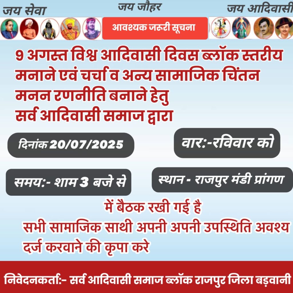 नि. प्र. (राजपुर) संयुक्त राष्ट्र संघ द्वारा घोषित विश्व आदिवासी दिवस मनाने को लेकर प्रदेशभर समेत जिले के आदिवासी समाज एवं संगठनों में हलचल तेज हो गई है|